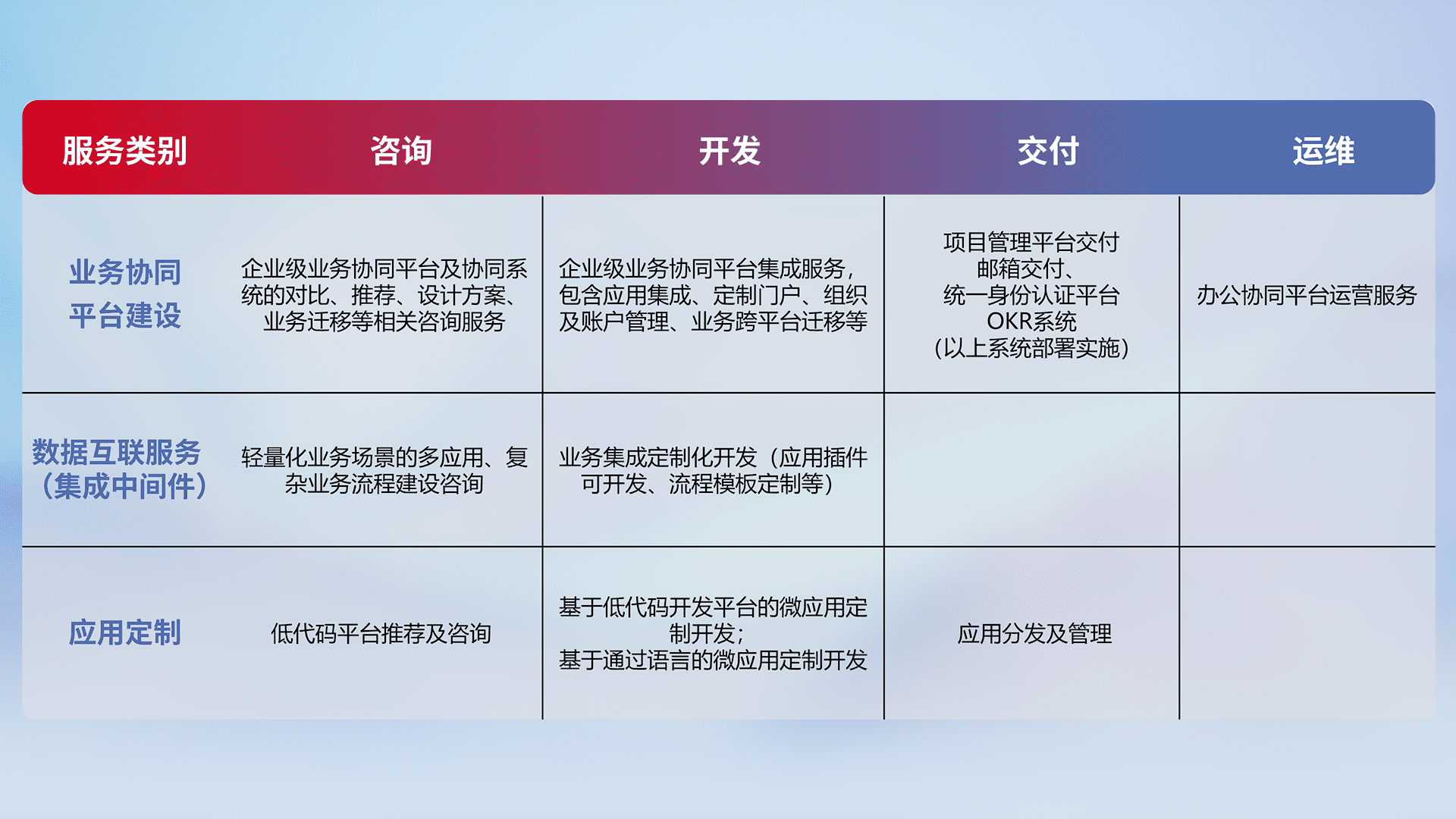 针对钉钉、、、、企微、、、IDaas等平台级产品提供产品的规划、、方案、、、、交付、、、、定制化开发等服务,,,实现如统一协同办公、、、智能客户服务、、、混合会议管理、、、智能数据查询、、、、等业务场景,,实现数字化转型。。。